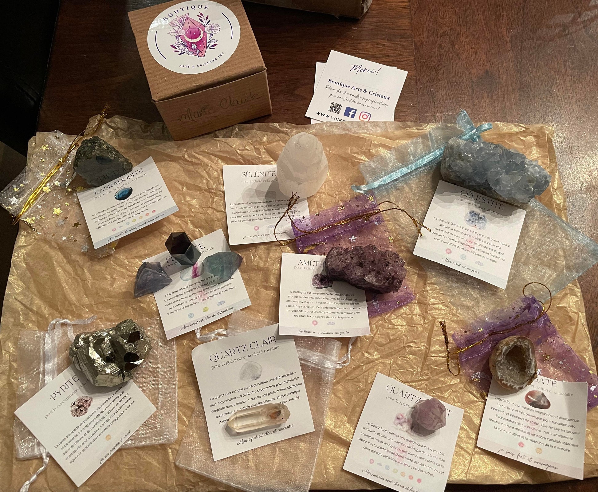 Ta boîte surprise contiendra un assortiment de pierres/cristaux avec feuillet sur leurs propriétés, bijoux, items aromatiques, accessoires, et un message personnalisé écrit à la main par Vicky🤍