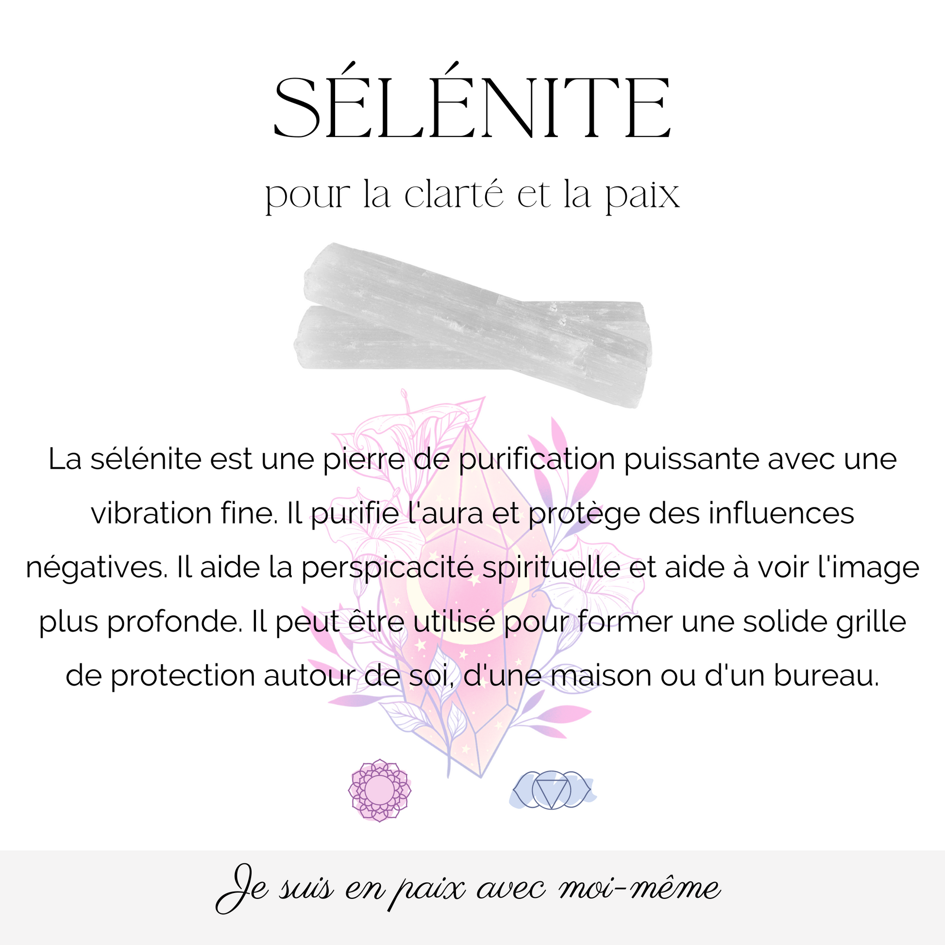 La Sélénite est une pierre d’apaisement et de sérénité, qui vous aidera à diffuser le positif dans votre lieu de vie, comme dans votre esprit. Elle nous renforce pour commencer un nouveau départ avec des bases saines et solides.