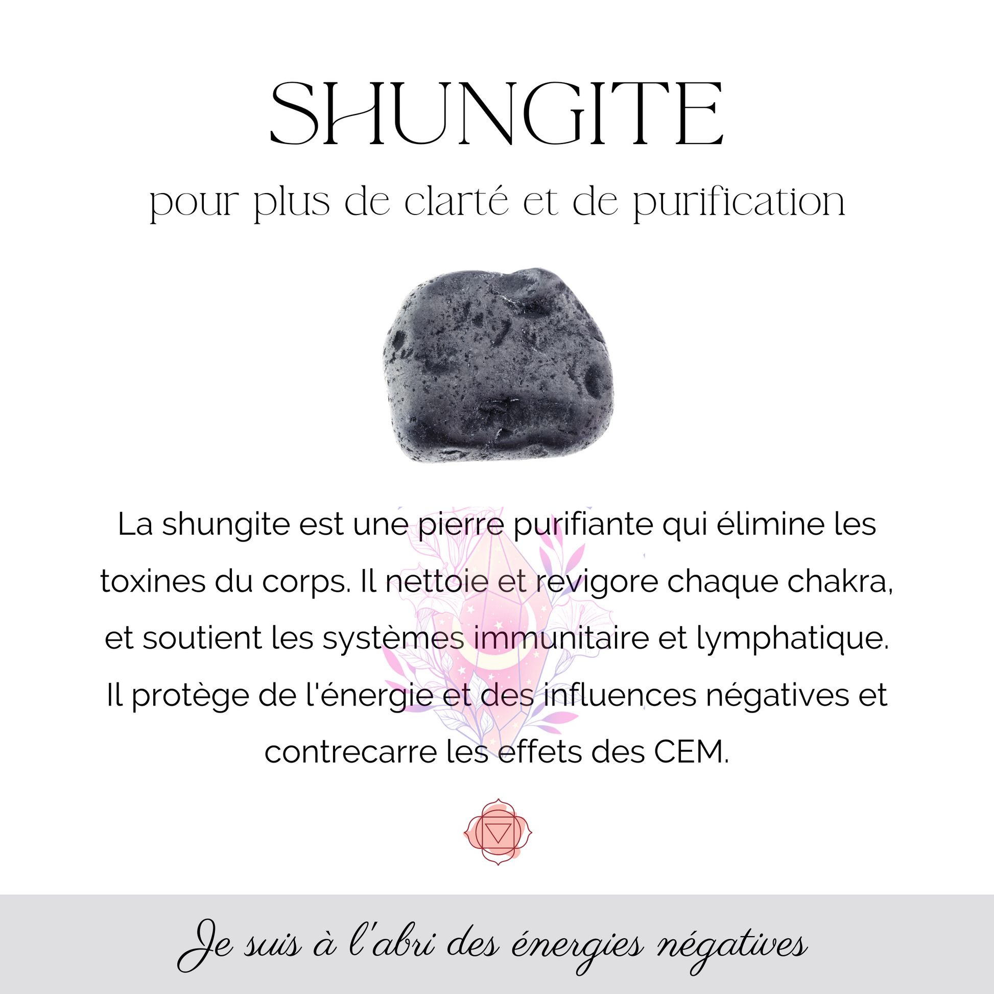 La shungite est de couleur noire et serait du carbone presque pur. Il se trouve dans la région de Carélie en Russie, près du village de Shunga. La shungite travaille pour nettoyer et aligner toutes les particules du corps, afin qu'elles soient ouvertes à la conjonction rapide avec la Lumière. La shungite aide les personnes non mises à la terre à mieux se connecter avec la Terre. Il fournit une aura de protection psychique et est une pierre de vérité. Il dissipe la négativité et apporte la lumière spirituelle. Sur le plan émotionnel, il est excellent pour abandonner les sentiments profonds de peur, de culpabilité ou de honte. On dit également qu'il protège les rayonnements électromagnétiques nocifs de toute origine comme les ordinateurs, les téléphones portables et autres.